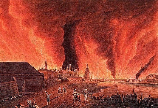 Первые пожары в Москве занялись с началом входа в город авангарда маршала Мюрата 2 сентября. К 3 сентября, времени занятия Кремля лично Наполеоном, пламя охватило уже весь город. Пожар стих только 6 сентября, за это время он уничтожил 6,5 тыс. из 9,1 тыс. жилых домов, 122 из 329 храмов. Эту «работу» российская, потом советская и снова российская историография списала на войска Наполеона. Правда, французы до сих пор уверены, что Москву сожгли сами русские… Доктор исторических наук, профессор Историко-архивного института РГГУ Михаил Давыдов так описывал эволюцию официальной версии о пожаре: «В нашем Отечестве исторические концепции московского пожара последовательно менялись в зависимости от политической конъюнктуры. Александру I важно было представить этот пожар как варварский акт, совершенный французскими агрессорами и оккупантами, чтобы дискредитировать их в глазах просвещённой Европы. Затем правда постепенно восторжествовала, были даже опубликованы записки непосредственного исполнителя приказа Ростопчина. При советской власти, в 20-30-е годы, концепция не менялась. Но после Великой Отечественной войны Сталин фактически создал культ фельдмаршала Кутузова, и этот пожар объявили частью его стратегического замысла. Затем не патриотичная версия об ответственности русских за сожжение Москвы была подвергнута суровой критике. Но великий историк Евгений Тарле нашел выход из положения. Он подчеркнул, что моральную ответственность за пожар всё равно несет Наполеон. Не было бы вторжения его армии в 1812 – Москва бы не сгорела». Французская же версия (впрочем, её же придерживаются и историки цивилизованных стран) гласит обратное – Москву сожгли сами русские. Тактика выжженной пустыни на протяжении веков приносила успех российской армии, так было во всех войнах, ведшихся на территории России и СССР. Кратко эту версию можно прочитать из французских газет осени 1812 года, время от времени её перепечатывают и современные французские СМИ. «14 сентября русские подожгли торговые ряды, рынок и здание больницы. А 16 сентября поднялся сильный ветер. По приказу генерал-губернатора Ростопчина 300-400 негодяев подожгли город одновременно в пятистах разных точках. Так как 5/6 всех домов были выстроены из дерева, то огонь распространился с огромной быстротой – это был поистине океан огня. Около 100 поджигателей были арестованы и расстреляны, при этом все они заявили, что действовали по приказу Ростопчина и ещё одного высокопоставленного лица. В огне заживо сгорели 30 тысяч больных и раненых русских. Русские потеряли всё; они ничего с собой не увезли, ведь они всегда считали, что мы никогда не сможем дойти до Москвы, и этим самым лишь вводили своих людей в заблуждение. Увидев, что всё захватили французы, русские замыслили ужасный план: они решили уничтожить огнем свою первопрестольную столицу, и тем самым обрекли на нищету 200 тысяч жителей. В этом злодеянии, сотворённом преступниками, выпущенными из тюрем, повинен исключительно Ростопчин. Горожане пытались остановить распространение пламени, но московский генерал-губернатор загодя принял вселяющие ужас меры предосторожности: он дал повеление вывезти или уничтожить все средства для тушения пожара». Русское служило-карательное сословие отчасти признавалось, что это оно подожгло Москву в сентябре 1812 года. То
