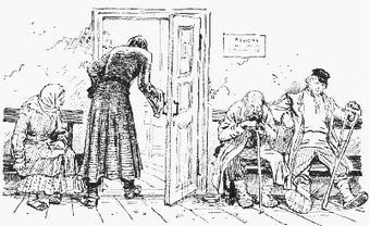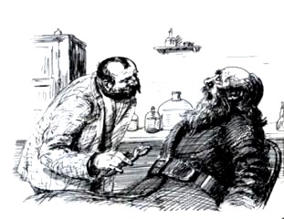 Земская больница. За отсутствием доктора, уехавшего жениться, больных принимает фельдшер Курятин, толстый человек лет сорока, в поношенной чечунчовой жакетке и в истрепанных триковых брюках. На лице выражение чувства долга и приятности. Между указательным и средним пальцами левой руки — сигара, распространяющая зловоние. ![]() В приемную входит дьячок Вонмигласов, высокий коренастый старик в коричневой рясе и с широким кожаным поясом. Правый глаз с бельмом и полузакрыт, на носу бородавка, похожая издали на большую муху. Секунду дьячок ищет глазами икону и, не найдя таковой, крестится на бутыль с карболовым раствором, потом вынимает из красного платочка просфору и с поклоном кладет ее перед фельдшером. — А-а-а... мое вам! — зевает фельдшер. — С чем пожаловали? — С воскресным днем вас, Сергей Кузьмич... К вашей милости... Истинно и правдиво в псалтыри сказано, извините: «Питие мое с плачем растворях». Сел намедни со старухой чай пить и — ни боже мой, ни капельки, ни синь-порох, хоть ложись да помирай... Хлебнешь чуточку — и силы моей нету! А кроме того, что в самом зубе, но и всю эту сторону... Так и ломит, так и ломит! В ухо отдает, извините, словно в нем гвоздик или другой какой предмет: так и стреляет, так и стреляет! Согрешихом и беззаконновахом... Студными бо окалях душу грехми и в лености житие мое иждих... За грехи, Сергей Кузьмич, за грехп! Отец иерей после литургии упрекает: «Косноязычен ты, Ефим, и гугнив стал. Поешь, и ничего у тебя не разберешь». А какое, судите, тут пение, ежели рта раскрыть нельзя, всё распухши, извините, и ночь не спавши... — М-да... Садитесь... Раскройте рот! Вонмигласов садится и раскрывает рот. ![]() Курятин хмурится, глядит в рот и среди пожелтевших от времени и табаку зубов усматривает один зуб, украшенный зияющим дуплом. — Отец диакон велели водку с хреном прикладывать — не помогло. Гликерия Анисимовна, дай бог им здоровья, дали на руку ниточку носить с Афонской горы да велели теплым молоком зуб полоскать, а я, признаться, ниточку-то надел, а в отношении молока не соблюл: бога боюсь, пост... — Предрассудок... (пауза). Вырвать его нужно, Ефим Михеич! — Вам лучше знать, Сергей Кузьмич. На то вы и обучены, чтоб это дело понимать как оно есть, что вырвать, а что каплями или прочим чем... На то вы, благодетели, и поставлены, дай бог вам здоровья, чтоб мы за вас денно и нощно, отцы родные... по гроб жизни... — Пустяки... — скромничает фельдшер, подходя к шкапу и роясь в инструментах. — Хирургия — пустяки... Тут во всем привычка, твердость руки... Раз плюнуть... Намедни тоже, вот как и вы, приезжает в больницу помещик Александр Иваныч Египетский... Тоже с зубом... Человек образованный, обо всем расспрашивает, во всё входит, как и что. Руку пожимает, по имени и отчеству... В Петербурге семь лет жил, всех профессоров перенюхал... Долго мы с ним тут... Христом-богом молит: вырвите вы мне его, Сергей Кузьмич! Отчего же не вырвать? Вырвать можно. Только тут понимать надо, без понятия нельзя... Зубы разные бывают. Один рвешь щипцами, другой козьей ножкой, третий ключом... Кому как. Фельдшер берет козью ножку, минуту смотрит на нее вопросительно, потом кладет и берет щипцы. — Ну-с, раскройте рот пошире... — говорит он, подходя с щипцами к дьячку. — Сейчас мы его... тово... Раз плюнуть... Десну подрезать только... тракцию сделать по вертикальной оси... и всё... (подрезывает десну) и всё... 