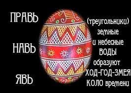 | Существует древний обычай расписывать на Пасху яйца по определенной технике, где куриное яйцо — символ жизни. Этот обычай существовал еще до христианизации Руси. А, следовательно, к современной Пасхе не имеет отношения. Как это было?  Писанки с мережками Стали обережками, В них мечта записана, Зло сбивает писанка. Писанки имеют сотни символов, значений-оберегов. Пожалуй, нет ни одного доброго пожелания, которое нельзя было бы выразить рисунком писанки. Самые распространенные орнаменты на писанках — солнечные знаки: •Всевозможные солнышки: круг, сочетание кругов, круги с прямыми и волнистыми линиями. •Растительные мотивы. Все цветы похожи на настоящие, но сказочные по расцветке. •Цветы, похожие на маленькие солнышки. Если такие цветы располагаются на «полюсах», это символизирует восход и закат — непрерывную смену дня и ночи, безконечность жизни. •Прямые, волнистые, зигзагообразные линии символизируют движение. Символы рисунков: •ласточки — приход весны, •спираль — знак долгой жизни (дарили пожилым людям), •зеленые сердечки — любовь (девушки дарили парням), •рушничок — для дочери (чтобы удачно вышла замуж), •яблочко, цветы — на рождение девочки… Символика цвета: •красный — цвет огня, радости, •желтый — цвет солнца, •черный — цвет земли, •коричневый — плодородие земли. Детям до совершеннолетия дарили только красные или зеленые писанки, т.к. юная душа должна была сначала окрепнуть, получить Силу. Краски применялись природные. Сырьем получения красок были цветы, листья, шелуха зерен, кора, корни, ягоды. Яйцо-писанка. Красить яйца — древний обряд, уходящий вглубь веков. Писанку не рисовали, а раписывали на сыром курином яйце. По преданиям, писанки — это звезды, рожденные Ладой-Богородицей. Раз в году славянской женщине выпадала честь представлять Богородицу на земле. В предрассветный час выносила она на порог волшебное пряльце и пряла нить, днем купала детей, пекла хлеб, а затем в теплой печи томила краски для писанок. Воду для этих красок брала накануне вечером из 7 родников. Домой несла молча, в тайне. Этой живой водой заливала сушеные травы , лепетки цветов, кору молодой дикой яблони и ставила на пару часов в печь. Пока готовилась краска, на сыром курином яйце горячим воском писалось обращение к Богам. Настоящая писанка сохраняла жизненную силу целую неделю (не протухала). Сперва яйцо окуналось в желтую краску «яблоньку» и держалось в ней пока читались гимны-обращения к Богам. Каждый цвет узора защищался воском. К концу работы яйца были больше похожи на темные колобки. Их опускали в горячую воду или подносили к огню. Воск плавился, и рождалась писанка. Первую писанку делали для Богов и Предков (можно было делать из деревянного яйца). Вторую — для родителей. Третья — для закликания весны. Четвертая — с узором на богатство и достаток в Роду. Продавать писанки было нельзя, а вот даровать — означало честь оказывать. Неряшливо расписанное яйцо силы не имело. Такое подношение считалось оскорблением. Не разрешалось дарить писанки тем, кто ведет кочевой образ жизни. А так же тем, с кем семья не желала иметь родства. Писанками нельзя было поминать мертвых. Разбитая писанка грозила засухой. Если такое происходило, то немедля скорлупу надо было измельчить и закопать в землю или же бросить в воду. Писанки ложили венчиком вокруг кулича 