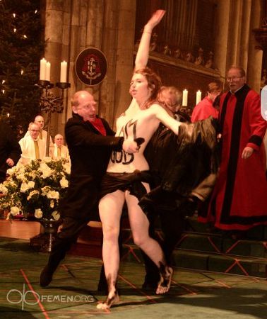 «Внезапно девушка, сидевшая в первом ряду, выскочила к алтарю и сорвала с себя одежду, оголившись по пояс. На теле у нее чёрной краской было написано «I am God» («Я Бог»)», -- рассказал в телефонном интервью агентству РИА Новости представитель кёльнской полиции.
