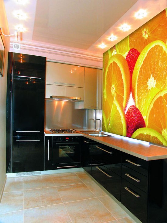 В последнее время фотообои в интерьере стали очень популярны. Фотообои на кухне будут очень уместны, смотрятся стильно, придадут помещению уникальность и неповторимость. Ассортимент фотообоев широко представлен в строительных гипермаркетах, можно подобрать и купить на любой вкус, а так же можно заказать фотопечать по собственному эскизу. Фотообои для кухни нужно подбирать из специальных влагостойких материалов на флизелиновой или виниловой основе. Чтоб фотообои можно было использовать для кухни, их покрывают специальной защитной пленкой, ламинируют – тогда они прекрасно себя чувствуют на кухне при влажной уборке, не боятся жира и копоти. Так же при покупки фотообоев для кухни внимательно читайте состав красителей на упаковке, красители должны быть водостойкие с УФ утверждением – это придает фотообоям стойкость к выгоранию. Какие же фотообои подобрать для интерьера кухни? Фотообои, подобранные в подходящей цветовой гамме могут визуально расширить квадратуру вашей кухни. Если ваша кухня маленькая, то подобрав фотообои с крупным рисунком в светлых ярких тонах, можно значительно увеличить пространство зрительно. Сейчас очень популярны фотообои для кухни с макроэлементами – это увеличенные в размерах ягоды и фрукты, цветы, бабочки. Если окна вашей кухни выходят на северную сторону, затемнены деревьями вам стоит использовать теплые тона в интерьере : желтый, оранжевый, персиковый. Если ваша кухня наоборот выходит окнами на южную солнечную сторону, свет стоит приглушать фотообоями в холодных тонах – зеленоватых, голубоватых. Правильно подобранные фотообои могут прекрасно расставить необходимые акценты, внести так сказать изюминку в ваш интерьер. Кухне в нейтральных тонах хорошо подойдут яркие фотообои, гармонирующие с кухонными занавесками, кухонным фартуком рабочей стенки. При выборе цветовой гаммы фотообоев для кухни нужно учитывать воздействие цвета на аппетит – если у вас нет проблем с лишним весом, то выбор цвета для вас не особо актуален. А для любителей вкусно и много покушать, стоит выбирать цветовую гамму в холодных тонах – в синем, сером, голубоватом. С какими рисунками выбирать фотообои? Для кухонных фотообоев хорошо подойдут натюрморты, изображения фруктов, ягод. Сейчас выпускаются фотообои с увеличенными изображениями этих элементов – это очень стильно и модно, но учтите, что лучше выбирать фотообои с нейтральными рисунками, чтоб они не напрягали вас в дальнейшем – ведь кухня это место где мы проводим больше всего времени.