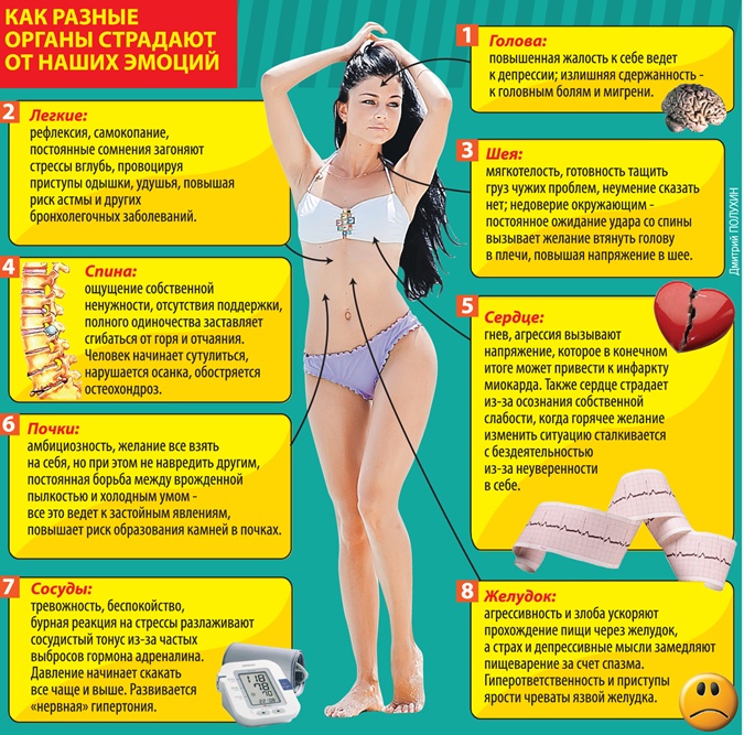 Пять чувств, которые могут быть реально опасными для нашего организма. О том, что "все болезни от нервов", люди догадывались с незапамятных времен. Сейчас же врачи говорят: в 60% хронических болячек виноваты наши "вредные" мысли и переживания. При этом успешное выздоровление лишь на 15% зависит от докторов и лечения, а на 85% - от нашего отношения к собственному здоровью и психологического настроя. По каким органам бьют наши мысли и эмоции, рассказали специалисты по психосоматике. 1. За метеочувствительность благодарите мнительность Жара резко сменяется прохладой или наоборот - и несчастные, зависимые от погоды, глотают горы таблеток или просто лежат в лежку. Если понаблюдать за такими людьми, можно найти общие черты характера: тревожность, мнительность, беспокойство по пустякам, склонность раздувать из мухи слона. Когда эти эмоции захватывают человека, страдает вегетативная нервная система. А проявлением таких расстройств зачастую как раз становится метеочувствительность, уверена врач-невролог Анна Горенкова. Что делать: чтобы привести в порядок свои нервы при таком складе характера, на ночь стоит принимать легкие успокоительные средства: по 25 капель пустырника или валерианы либо полстакана отвара зверобоя (столовая ложка на стакан кипятка). Утром расшевелиться и приободриться помогут отвар шиповника, настойка женьшеня или китайский лимонник. 2. Гастрит из жалости к себе У кого из нас не было моментов, когда кажется: весь мир против тебя, и если сам себя не пожалеешь, то кто же еще? С физиологической точки зрения жалость относится к астеническим реакциям, при которых в организме вырабатывается гормон слабости ацетилхолин, рассказывает психоэндокринолог Наталья Гридасова. Большое количество этого гормона не только ослабляет психику, но и ведет к развитию болезней пищеварительной системы (гастриты, проблемы с печенью и желчным пузырем), общему снижению иммунитета и слабой сопротивляемости инфекциям. Что делать: жалость к себе лучше всего лечится заботой о других. Наверняка в вашем окружении при ближайшем рассмотрении найдется не один человек гораздо несчастнее вас, которому реально нужна помощь словом и делом. 3. Агрессия сажает сердце Давно замечено, что агрессивные личности с диктаторским складом характера часто сочетают в себе, казалось бы, несовместимые черты: излишнюю жесткость, требовательность... и сентиментальность. Такие люди терроризируют окружающих и терзают своих близких. К тому же тираны совершенно не умеют расслабляться, они всегда готовы к нападению, поясняет профессор психиатрии Михаил Виноградов. Постоянное напряжение, привычка быть готовым к бою не проходят даром. Это выходит боком для сердечно-сосудистой системы и особенно бьет по сердцу. Повышает риск инфаркта миокарда. В то же время замечено, что проблемы с сердцем нередко встречаются у людей прямо противоположного склада характера: добрых, слабых и недеятельных. В отличие от удавов-агрессоров, такие "кролики" сочувствуют всему миру, но не пытаются что-либо изменить. Что делать: и агрессорам, и тем, кто принимает все близко к сердцу, помогут техники, ведущие к обретению гармонии: йога, ушу, дыхательные гимнастики. 4. На голову давит сдержанность Не менее вредна и другая крайность - излишняя сдержанность. Один из основоположников психосоматики, немецкий д