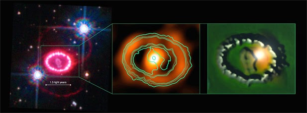 В 1987 году астрономы стали свидетелями насильственной смерти гигантской звезды в Южном полушарии. Теперь большая группа исследователей опубликовала результаты обширных наблюдений за сверхновой SN 1987A с помощью Атакамской Большой миллиметровой / субмиллиметровой решеткой (ALMA) в чилийской пустыне Атакама и Австралийского компактного массива радиотелескопов (ATCA) в Австралии. "Комбинируя наблюдения двух телескопов, мы смогли различить излучение расширяющейся ударной волны сверхновой от излучения, вызванного пылью, образующейся во внутренних областях остатка", сообщает Джованна Занардо из Международного центра радиоастрономических исследований (ICRAR) в Перте, Западная Австралия и ведущий автор исследования, опубликованного в The Astrophysical Journal. "Это важно, потому что означает, что мы в состоянии различить типы наблюдаемого излучения и искать признаки нового объекта, который, возможно, образовался при коллапсе ядра звезды". "Наши наблюдения радиотелескопов ATCA и ALMA показали признаки чего-то, никогда не виданного прежде, находящегося в центре остатка. Это может быть плерион, обусловленный спиннингом нейтронной звезды, или пульсар, который астрономы искали с 1987 года. Это удивительно, что только сейчас, с помощью больших телескопов, таких как ALMA и ATCA, мы можем увидеть сквозь мусор, образовавшийся при взрыве звезды, и посмотреть, что он скрывает", добавила она. Еще одно недавнее исследование, основанное на этих наблюдениях, решило давнюю загадку: почему одна сторона остатка сверхновой ярче другой. Также опубликованное в The Astrophysical Journal, второе исследование использовало подробную трехмерную компьютерную модель расширяющейся ударной волны сверхновой. Слева: изображение SN 1987A от Хаббла, 2010 год. Середина: изображение SN 1987A от ATCA и ALMA. Справа: визуализация остатка, показывающего возможное местоположение пульсара. Моделирование показало, что восточная, или левая, сторона растущей ударной волны набухает быстрее, чем другая сторона, в результате излучает больше радиоэмиссии, чем более слабая сторона. Это влияние становится гораздо более очевидным, когда ударные волны врезаются в экваториальные кольца, как показано на изображении космического телескопа Хаббл. "Тот факт, что модель соответствует наблюдениям, означает, что теперь мы понимаем физику расширения остатков и начинаем понимать состав среды, окружающей сверхновую, что является большой частью головоломки процесса формирования остатка SN 1987A", добавляют исследователи. На иллюстрации - Слева: изображение SN 1987A от Хаббла, 2010 год. Середина: изображение SN 1987A от ATCA и ALMA. Справа: визуализация остатка, показывающего возможное местоположение пульсара. |