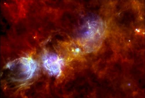 Совсем как дети, которых делят в школе на группы, «семена» новых звезд так же могут делиться на «классы» в зависимости от возраста. Это особенно справедливо для областей, где рождение звезд в облаке газа и пыли «запускается» благодаря какому-либо внешнему событию, такому, как взрыв близлежащей сверхновой. На этом снимке космической обсерватории Гершель (Herschel) европейского космического агентства ESA показана последовательность регионов звездообразования в молекулярном облаке W48, которое находится на расстоянии 10 000 световых лет от нас в созвездии Орла (Aquila). ![]() Голубое облако внизу слева – это самая «взрослая» звездная колыбель на снимке. Молодые и массивные звезды, которые находятся внутри облака, формируют вокруг него пузырь и нагревают диффузный газ, заставляя его светиться в самых длинных волнах светового диапазона, доступных «глазу» Гершель. Справа в еще одном светящемся облаке собраны скопления, которые позже станут массивными звездами. Эти скопления, некоторые из которых видны как яркие пятна света, так же разделяются в зависимости от возраста: более взрослые расположены внизу слева, а более молодые – вверху справа. Самым молодым на этом снимке является небольшой светло-голубой участок в центре снимка, в котором находятся зачатки будущих массивных звезд. Астрономы считают, что эта последовательность звездных рождений была образована в результате взрывов нескольких десятков сверхновых, который произошли более 10 миллионов лет назад в области, называемой Aquila Supershell, которая находится за пределами левого края снимка. Сжимая окружающее вещество, эти сверхновые могли спровоцировать волну звездообразования, которая, один за другим, зажгла эти регионы. Это изображение является мозаикой из снимков, сделанных в диапазоне 70 микрон (голубой), 160 микрон (зеленый) и 250 микрон (красный). Вверху слева – север, а внизу слева - восток. Данные были получены приборами PACS и SPIRE в сентябре 2010 года. |