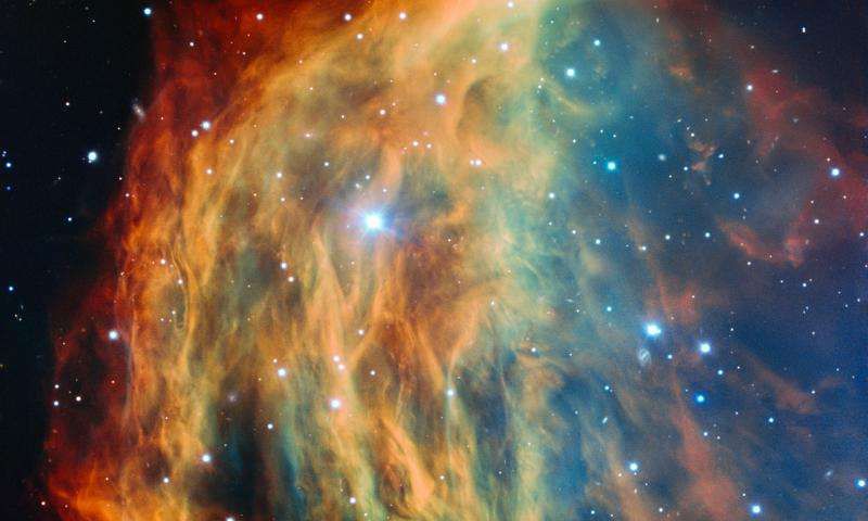 С помощью Большого Телескопа Европейской Южной обсерватории в Чили астрономам удалось получить детальное изображение планетарной Туманности Медуза. Звезда, расположенная в центральной части туманности, вытолкнула ее внешние слои в космос, формируя разноцветные облака. Подобная участь в конечном итоге постигнет и наше Солнце: со временем оно также станет такого рода объектом. Эта красивая планетарная туманность была названа в честь страшного существа из греческой мифологии — Медузы Горгоны. Туманность также известна под названием Шарплес 2-274 и расположена в созвездии Близнецы. Туманность Медузы охватывает в поперечнике около четырех световых лет и находится на расстоянии около 1500 световых лет от Солнца. Несмотря на свои размеры она очень тусклая и труднозаметная. ![]() Медуза Горгона – это мифическое существо со змеями вместо волос. В случае с туманностью змеями выступают нити светящегося газа. Красное свечение, исходящее от водорода, и зеленое – от кислорода образуют в небе полумесяц. Выброс массы на этой стадии эволюции звезд часто прерывистый, в результате чего планетарная туманность может приобретать удивительную структуру. На протяжении десятков тысяч лет звездные ядра планетарных туманностей окружают эти невероятно яркие облака газа. В течение последующих нескольких тысяч лет газ медленно рассеивается в окрестностях. Это последний этап в трансформации звезды, подобной Солнцу, после чего она завершит свою активную жизнь, превратившись в белого карлика. Этап планетарной туманности – это лишь краткий период в продолжительной жизни звезды. Жесткое ультрафиолетовое излучение очень горячей звезды, находящейся в ядре туманности, заставляет атомы газа во внешних слоях терять свои электроны, в результате чего газ ионизируется. Характерные цвета этого светящегося газа могут помочь в идентификации объектов. В частности, зеленое свечение от двукратно ионизированного кислорода ([O III]) позволяет различить планетарные туманности. Применяя соответствующие фильтры, астрономы могут выделить излучение от светящегося газа и сделать тусклые туманности более выраженными на темном фоне. Туманность Медузы также называют Abell 21 (формально PN A66 21) в честь американского астронома Джорджа О. Абеля (George O. Abell), открывшего данный объект в 1955 году. Некоторое время ученые спорили о том, что представляет собой открытый объект. Исследователи предполагали, что облако может быть остатком взрыва сверхновой. Однако в 1970-е годы исследователи смогли изучить свойства материала в облаке, после чего оно было классифицировано как планетарная туманность. |
