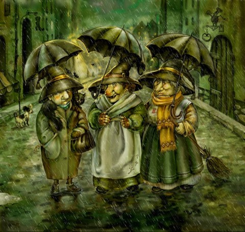 Три грации, три бывших юных девы Однажды встретились под проливным дождём. Где ты, Весна? Мечты, Надежды, где вы? Давайте-ка на Броккен не пойдём!