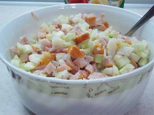 Все ингредиенты в равных пропорциях нарезать кубиками и соединить.