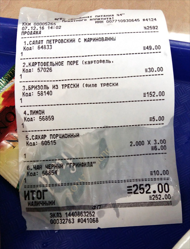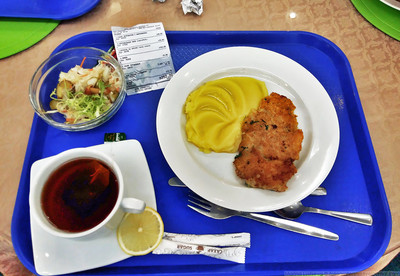 Каково же оно на вкус, спросите вы? Да обычное, это же столовая, а не ресторан. В салате с маринованными ингредиентами явно лишние свежие веточки, но это я придираюсь; пюре из нормальной картошки, лимон подсохший, треска — ничего нового. Да, и поднос потом на ленту не забыть поставить.