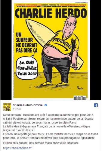 СМИ сообщили, что Charlie Hebdo высмеял собор РПЦ, заявив, что на обложке нарисован собор с куполами, которые украшают надутые лица. На самом деле — там изображен Франсуа Олланд. Собор с «крамольными» куполами есть, но карикатура спрятана внутри еженедельника. Charlie Hebdo, регулярно публикующий провокационные карикатуры, в том числе на трагические события, на этот раз проанонсировав статью на первой обложке номера, опубликовал карикатуру, дополненную статьей об истории православия, на одной из страниц журнала. Статья в еженедельнике содержит краткий экскурс в историю православия в России в ХХ и начале ХХI века, а события, предшествующие открытию центра и храма, излагаются в язвительной и насмешливой манере, передает РИА Новости. Карикатуру нарисовал художник Рисс, изобразивший храм, на куполах которого нарисованы надутые лица, как выясняется, сами знаете кого. В Госдуме этот инцидент вызвал традиционное возмущение, но Госдума не будет реагировать на этот недружественный шаг Франции, передает ФАН со ссылкой на Сергея Гаврилова — депутата Государственной Думы от фракции КПРФ, председателя комитета по делам общественных объединений и религиозных организаций. Мнения россиян разделились. Одни считают, что Charlie Hebdo всё правильно сделал, высмеяв РПЦ — «этот оплот средневековья и религиозного мракобесия». Другие прибывают в праведном гневе, отправляя издание в ад. Есть и те, кто, посмеиваясь, убежден, «что с дураков взять нечего, кроме анализов». Равнодушных среди наших граждан нет, судя по комментариям к этой новости на различных информационных ресурсах. Более точные настроения, скорее всего, определят социологические опросы, которые в ближайшее время проведут топовые аналитические центры страны, воспользовавшись такой прекрасной возможностью продемонстрировать социальный срез. Это важный момент. Вчера почти все СМИ сообщали, что Charlie Hebdo высмеял собор РПЦ. И понеслось. В РПЦ статью назвали богохульством. Ведущий интернет-проекта «Батюшка онлайн» иеромонах Макарий (Маркиш) заявил, что «мы сожалеем об их дикости, мы сожалеем об их глупости, мы сожалеем об их богохульстве, но, как говорится, в чужой монастырь со своим уставом не ходят», передают Вести. ру. Глава комитета Госдумы по образованию и науке Вячеслав Никонов предположил, что эта «карикатура по российскому законодательству была бы расценена как оскорбление чувств верующих», пишет «МК». А протоиерей Всеволод Чаплин заявил, что появление такой карикатуры от команды еженедельника — это «перманентная истерика, вызванная перманентным страхом перед лицом сильной религии», пишет Life.ru со ссылкой на аудиозапись Чаплина. «Эти люди неслучайно так истерично относятся и к исламу, и православию, и католической церкви. Цивилизация безбожия, которую они представляют, обречена», — рассказал Чаплин информационной службе. Телеканал РЕН ТВ на своем сайте сообщил, что «на обложке французского издания нарисован собор, на куполах которого изображены надутые лица». НТВ же указал, что о карикатуре сообщается только на обложке издания в нескольких строчках (тот самый анонс), а «само же изображение находится на одной из страниц журнала», опубликовав обложку очередного скандального номера. На обложке нарисованы не купола с искаженными лицами, а французский президент Франсуа Олланд, который держит 
