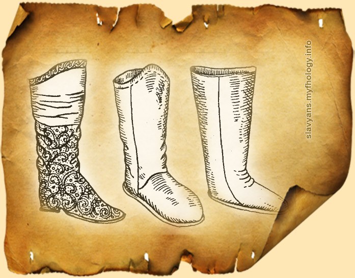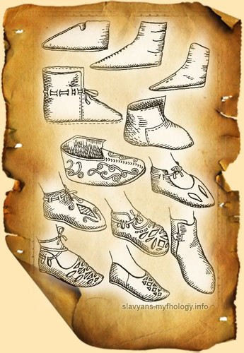 По́ршни — простейшая русская кожаная обувь, известны на Руси с давних пор: ещё в VII веке похожую обувь носили восточные славяне, а позже - небогатый городской люд. Само слово "поршни" переводится с древнерусского "лоскут" или "рыхлый". Прототипом поршней считаются сандалии или кусок цельной кожи, которой оборачивали ногу древние люди.Некоторые историки полагают, что в древности для изготовления поршней кожу снимали с нижней части лапы животного. По внешнему виду поршни - это мягкие туфли, сшитые из одного или двух кусков кожи. По краям поршней продевались в сделанные отверстия ремешки, которые затягивались у голени и тем самым крепили поршни на ноге. Известен также другой вид поршней, которые состояли из трёх частей: одна служила подошвой, другая - образовывала бортики и задник, а третья нашивалась на носок. Как и любая другая подобная обувь, поршни носили с холщовыми или суконными онучами и подвязывали их к ноге кожаными оборами. Праздничные поршни украшались вышивкой или бахромой. Чаще всего вышивка представляла собой узор из растений, который перемежался с бесконечной плетёнкой. Для того, чтобы выделить рисунок, его делали цветными шерстяными, льняными и шёлковыми нитками. Башмаки - группа обуви древних славян — туфли, или башмаки, — отличается от поршней вшитой подошвой. «Вшитая подошва» звучит не слишком красиво, ибо «подошва» .уже само по себе — «то, что пришито». Её нередко кроили даже из другого вида кожи, нежели верх, и соединяли самыми разнообразными видами швов. Для подошв чаще всего использовалась толстая, прочная кожа из хребтовой части шкуры (иногда лошадиной), а для верха — более эластичная и мягкая, взятая с брюха, «чрева» животного (обычно коровы или козы). Нежные, тонкие башмачки назывались поэтому «черевиками». Это слово сразу вызывает в памяти «Ночь перед Рождеством» Н. В. Гоголя и кажется нам специфически украинским. Тем не менее оно очень древнее — его нашли в рукописях домонгольской Руси. Более же привычный «башмак» пришёл к нам, как пишут учёные, из турецкого языка, а «туфля» — из германских диалектов, заимствовавших его, в свою очередь, из греческого. Сапоги - По мнению исследователей, слово «сапог» попало к славянам от тюркоязычных соседей — кыпчаков, печенегов, кочевников-болгар — и уже из древнерусского языка перешло в финский, карельский эстонский, литовский, латышский. Судя по археологическим данным, сапоги в деревне почти не употреблялись, зато в городе их носили практически все мужчины и женщины, богатые и бедные, дети и старики. Сапоги имели не очень высокое — ниже колена — голенище, которое спереди было обычно повыше, чем сзади, и мягкую подошву без каблука и железных подковок. Иногда такая подошва кроилась из нескольких слоев кожи. Когда она пронашивалась целые части сапога нередко использовали повторно пришивали к новой подошве или, например, кроили из голенищ поршни. Как пишут учёные, сапоги бытовали в основном: двух видов. Одни имели мягкое, слегка расширяющееся кверху голенище, примерно равное по высоте длине следа ноги. У щиколотки оно схватывалось ремешком продёрнутым в прорези. Раскопки показали, что на улицах древнего Пскова часто можно было встретить детей и подростков в подобных сапожках: археологами найдены образцы с длиной следа 12 и 17 см. точно такие, только побольше, носили и взрослы