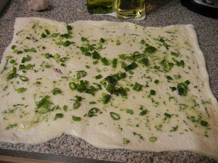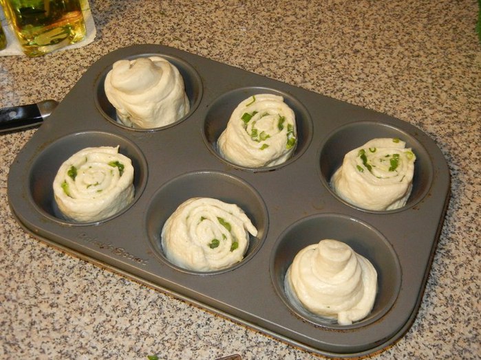 Ингредиенты: Тесто для пиццы – 220 г Сливочное масло – 4 столовых ложки Чеснок – 2 больших зубчика Укроп – 1 столовая ложка (мелко нарезанный) Зеленый лук – 1 столовая ложка (мелко нарезанный) Соль крупного помола для посыпки – 1-2 столовых ложки Приготовление: Духовку нагрейте до 200 градусов. 6 формочек для кексов смажьте сливочным маслом. Выжмите чеснок и смешайте его со сливочным маслом, укропом и луком. Раскатайте тесто тонко и нанесите на него ровным слоем приготовленную смесь. Скрутите тесто в рулет и нарежьте на 6 равных частей. Выложите их в формочки для кексов. Присыпьте солью. Выпекайте 18-20 минут до золотисто-коричневой корочки. ![]() |