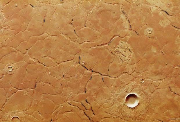 Планетологи представили снимок загадочной сети лабиринтов, расположенных на равнине Утопия в северных низменностях Марса. Изображение доступно на сайте Европейского космического агентства. Показанный учеными лабиринт представляет собой случайным образом разбросанные блоки, в поперечнике достигающие 5–20 километров и разделенные сквозными желобами шириной до 2 километров. Изображение, представленное учеными, имеет разрешение 15 метров на пиксель, и сделано при помощи европейской станции Mars Express, вращающейся вокруг Марса. Аналогичные пейзажи наблюдаются и на Земле, где они возникают в результате осаждения мелкозернистых осадков в океане. Вероятно, в древности на месте современных лабиринтов располагалось дно крупного водоема, или же геологическое образование появилось в результате крупного потопа. По мнению ученых, главная роль в том, что лабиринт принял свой современный вид, принадлежит водяному льду, который по мере замерзания расширился и таким образом деформировал окружающие его породы ![]() |