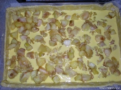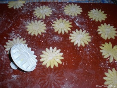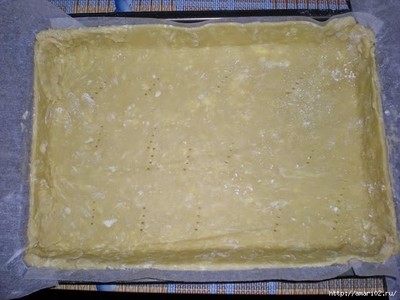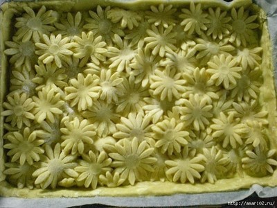 Вкусный и очень красивый пирог из песочного теста получается по этому рецепту. Можно его украсить, вырезав цветы формочкой для печенья,но это уже Ваше желание, а можно приготовить просто. Но в любом случае, он готовится просто и получается очень вкусным. Знакомьтесь с рецептом. Для теста Масло сливочное — 200 г Мука — 2+1/3 стак. Соль — щепотка Яйцо — 1 шт Ванильный сахар — 1 пакет. Сахар — 0,5 стак. Разрыхлитель — 1 ч. л. Сметана- 2 ст.л. В заливку Крахмал — 1 ст. л. Сахарная пудра — 2 ст. л. Яйцо — 2 шт Сметана — 6 ст. л. В начинку Яблоко — 3 шт Корица — 1/2 ч.л. Сахар — 2 ст.л. Приготовление Просеять муку с разрыхлителем, всыпать ее в блендер. Холодное сливочное масло натереть на крупной терке и смешать с мукой с помощью блендера. Яйцо взбить с сахаром и солью, добавить ванилин, сметану. Тщательно перемешать Соединить обе части и быстро замесить тесто. Долго месить не нужно, чтобы масло не растаяло. Оно получается очень нежным, мягким, податливым. Завернуть тесто в пленку и убрать в холодильник. Яблоки очистить, нарезать небольшими кусочками, высыпать в кастрюльку, добавить сахар и корицу и немного припустить, не допуская разваривания. Остудить. Если яблоки небольшие, возьмите 4 штуки. Приготовить заливку. Взбить яйца с сахарной пудрой, добавить сметану и крахмал. Тщательно перемешать. Достать тесто из холодильника, отделить 1/3 часть и вернуть её обратно. Большую теста раскатать в прямоугольник и выложить в форму. (Размер формы 20 х 30 см.) Это удобно делать между двумя листами бумаги для выпечки. Тесто прямо на нижнем листе перенести в форму. Руками поправить тесто, лишние кусочки срезать, где нужно – добавить. С песочным тестом – это просто. Наколоть вилкой по всей поверхности. Вылить на тесто в форме заливку. Поверх нее равномерно распределить яблоки. Вынуть из холодильника оставшееся тесто, раскатать и формочкой вырезать цветочки. При формовки цветов доску и само тесто слегка присыпать мукой, потому что тесто нежное и при выдавливании формочкой слегка липнет к доске. Поверх яблок густо выложить цветочки, стараясь покрыть всю поверхность. Выпекать 40 минут при температуре 175*С. Не спешите вынимать из формы готовый пирог, пусть остынет хотя бы до теплого состояния, потому что пирог очень нежный.. Когда пирог остынет, слегка притрусить его сахарной пудрой. ![]() |