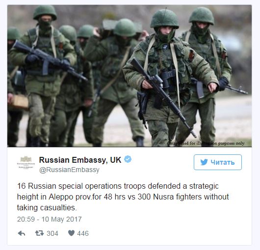 На сирийской земле идут тяжёлые бои везде, где территория Сирийской Арабской Республики находится под контролем террористов ИГИЛ* или так называемой «умеренной оппозиции». Ни для кого не секрет, что в борьбе с терроризмом Дамаску активно помогает Москва. Помогая словом на политической арене и делом в боях за свободу Сирии и безопасность мира от ига терроризма. В боях с ИГИЛ* САА с воздуха поддерживает и собственная сирийская авиация, и российские лётчики. Но долгое время за кадром оставалась работа российского спецназа, тяжёлая и опасная, зачастую в глубоком тылу боевиков. Именно российские спецназовцы обеспечивали высочайшую, хирургическую точность авиаударов по базам, складам и тренировочным лагерям боевиков. Подробности одной из таких операций недавно стали достоянием общественности и произвели настоящий фурор в СМИ и соцсетях. Напомним, накануне, президент России лично вручил золотую звезду Героя России командиру подразделения, еще троих офицеров наградили орденами. Командир одного из отрядов спецназначения, действующего в Сирии, на награждении поделился обстоятельствами своего подвига. 16 спецназовцев почти двое суток удерживали позиции под натиском трёх сотен боевиков Ан-Нусры* (ныне Джебхат Фатах аш-Шам*) до подхода солдат Сирийской Арабской Армии. Твиттер Посольства России в Британии Подобная новость просто не могла не пройти мимо внимания мировых СМИ. Тем более что поводы для гордости у россиян есть. Посольство Российской Федерации в Великобритании на своей странице в Твиттере опубликовало запись, посвящённую этому героическому бою русского спецназа, который без потерь отбивал атаки превосходящих сил террористов. twitter.com Это указывает не только на большую храбрость, но и на тактическое превосходство Примерная работа! Истинные борцы с терроризмом в регионе. Пусть все они благополучно вернутся домой. Очень круто. Удивительные ребята. Спартанцы, каждый из них Бог благословит российские войска. Да поможет им Бог. Иностранные читатели страницы высоко оценили профессионализм российских спецназовцев. Люди со всего мира восхищаются российским спецназом, и это очередной повод гордиться своей страной. Десятки комментариев выражают поддержку и России и спецназовцам. Показательно, что один из комментаторов заявил, что шестеро британских спецназовцев смогли бы это повторить. И в тот же момент ему утёрли нос, напомнив, что Великобритания поддерживает Ан-Нусру*, и создала «Белых Касок». А «Каски» — пропагандистское звено террористов, повинное не только в многочисленных жертвах среди мирного населения, но и причастное к провокациям с химическим оружием в Хан-Шейхуне. twitter.com 6 британских SF(Special Forces) сделали бы это Нет, я почти уверен, что британцы снабжают Аль-Нусру, и сражаются на одной стороне с этой грязью Британия поддерживает Аль-Каиду и создала белые шлемы — не настоящих спасателей. Не связывайтесь с русскими. Гитлер сделал это, и посмотрите, где он оказался *Исламское государство, сокращённо ИГ, ИГИЛ, ДАИШ — международная организация, действующая преимущественно на территории Сирии, признана в России террористической и запрещена. Другие организации также считаются террористическими и запрещены. ![]() |