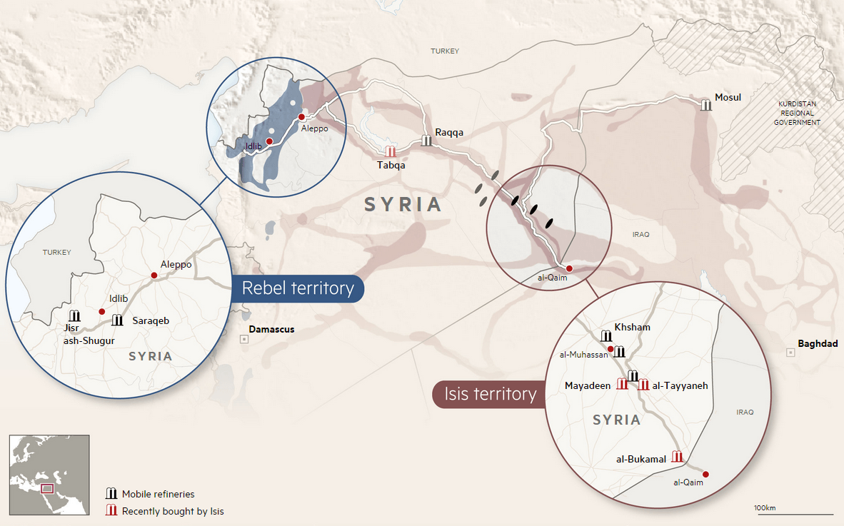 Террористическая группировка «Исламское государство» контролирует большую часть нефтяных месторождений Сирии. После того, как террористам удалось добиться значительного успеха и завладеть таким стратегическим активом как нефть, у них возникла необходимость выстроить систему доставки и переработки сырья для его последующей продажи. Основной объем нефти, который попадает в руки ИГ, добывается на территории сирийской провинции Дейр-эз-Зор. Как утверждается в документах, оказавшихся в руках журналистов издания Financial Times, в среднем в сутки на данной территории добывается около 34-40 тыс. баррелей. Помимо этого, боевики ИГ контролируют месторождение Кайяра вблизи иракского города Мосул. По оценкам экспертов, объемы добычи там не превышают 8 тыс. баррелей, причем большая часть этой нефти может быть использована только для производства асфальта. Итоговый объем «черного золота», который добывается на месторождениях, попавших по контроль ИГ, экспертам не известен. Это связано с тем, что уровень добычи, после захвата их боевиками, заметно снизился в результате уничтожения инфраструктуры, отсутствия необходимых технологий и неспособности террористов завербовать квалифицированных рабочих. Тем не менее, они по-прежнему обеспечивают ИГ нефтью, доходы от продаж которой используются для дальнейшего финансирования террористической деятельности. Стоимость барреля нефти, который реализуется боевиками ИГ, зависит от ее качества, на некоторых месторождениях цена составляет лишь $25, а ряд месторождений в Сирии приносят $40 за баррель. В целом, по оценкам экспертов, ИГ зарабатывает на продаже нефти $1,53 млн в день. Один из ключевых мифов о ИГ – это финансовая модель группировки, основанная на экспорте нефти в соседние страны. Financial Times пишет, что ИГ получает основной доход от реализации нефти на внутренних рынках. Фактически, сделки заключаются прямо на месте добычи нефти, где постоянно находятся независимые трейдеры, которые выкупают весь объем «черного золота» для последующей его перепродажи. Это довольно организованная система, сирийские и иракские трейдеры перекачивают всю нефть на танкеры, которые находятся в портах, максимально приближенных к местам добычи. У трейдеров есть несколько способов заработать на купленной нефти: •отправить нефть на ближайший завод, где ее переработают, после чего уже готовое для использования топливо доставить вновь на «биржу» вблизи месторождения нефти. •продать нефть трейдерам, которые на небольших автомобилях доставляют ее повстанцам на севере Сирии или востоке Ирака. •попытаться реализовать нефть крупному нефтеперерабатывающему заводу или продать весь объем на внутреннем рынке, крупнейший из которых находится на сирийско-иракской границе вблизи города Аль-Каим. Большинство трейдеров предпочитают использовать первый вариант, поскольку он менее рискован и позволяет заработать дополнительные $10 за баррель нефти. Основная часть НПЗ, которые контролируются ИГ, находятся на востоке Сирии, еще несколько заводов расположены на подконтрольных боевикам (ССА, Исламский фронт, Джебхат ан-Нусра) территориях северо-западе страны, но качество производимых ими продуктов переработки крайне низкое. Чаще всего нефть перерабатывается в бензин и мазут, но из-за того, что большинство НПЗ не способны произво