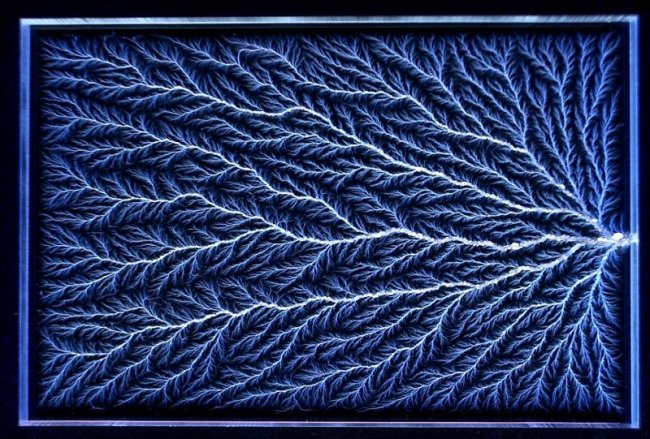 Скульптор Берт Хикман вместе с физиком Тоддом Джонсоном создали небольшую серию работ под общим названием "Пойманная молния". Подобные рисунки получаются в результате воздействия ускорителя частиц мощностью 5 миллионов вольт на акриловые блоки.