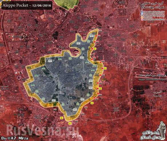Боевики коалиции «Фатх Халеб» сдали практически всю оставшуюся часть «Алеппского котла» и покидают город вместе с семьями после договорённости, достигнутой ночью между российским и турецким правительствами. Бандформирования сдают подразделениям Армии Сирии как минимум 4 района самого большого сирийского города и под контролем Дамаска будет уже 85% территории всего восточного Алеппо. Прямо сейчас за бандитами уже прибыли автобусы для эвакуации их в провинцию Идлиб. Кроме того, часть террористов не эвакуируется на автобусах, а выходит через подготовленный для них 700 метровый коридор из северо-восточной части Алеппо в юго-восточную, в районы еще контролируемые бандформированиями. Этот проход расположен и ежду Алеппской цитаделью, районом ас-Сафсафа и больницей аль-Аюн. По российско-турецким договорённостям правительству САР переходят округа Аль-Фарфра, Карм-аль-Джабаль, Баб-Хадид и Афиун. Трансляция началась 30 нояб. 2016 г.