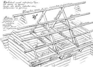 Между венцами в срубе прокладывали мох и после окончательной сборки сруба конопатили льняной паклей щели. Тем же мхом часто закладывали и чердаки для сохранения тепла зимой.В плане срубы делали в виде четырехугольника ("четверик"), либо в виде восьмиугольника ("восьмерик"). Из нескольких рядом стоящих четвериков составлялись, в основном, избы, а восьмерики использовались для строительства деревянных церквей (ведь восьмерик позволяет увеличить площадь помещения почти в шесть раз, не изменяя длину бревен). Часто, ставя друг на друга четверики и восьмерики, складывал древнерусский зодчий пирамидальное строение церкви или богатые хоромы. Простой крытый прямоугольный деревянный сруб без всяких пристроек назывался "клетью". "Клеть клетью, поветь поветью", — говорили в старину, стремясь подчеркнуть надежность сруба по сравнению с открытым навесом — поветью. Обычно сруб ставился на"подклете" — нижнем вспомогательном этаже, который использовали для хранения запасов и хозяйственного инвентаря. А верхние венцы сруба расширялись кверху, образуя карниз — "повал". Это интересное слово, происходящее от глагола "повалиться", часто использовалось на Руси. Так, например, "повалушей" называли верхние холодные общие спальни в доме или хоромах, куда вся семья уходила летом спать (повалиться) из натопленной избы. Двери в клети делали как можно ниже, а окна располагали повыше. Так тепло меньше уходило из избы. Кровлю над срубом устраивали в древности безгвоздевую — "самцовую". Для этого завершения двух торцовых стен делали из уменьшающихся обрубков бревен, которые и называли "самцами". На них ступеньками клали длинные продольные жерди — "дольники", "слеги" (ср. "слечь, лечь"). Иногда, правда, самцами называли и концы слег, врубленные в стены. Так или иначе, но вся кровля получила от них свое название. Сверху вниз поперек в слеги врезали тонкие стволы дерева, срубленные с одним из ответвлений корня. Такие стволы с корнями называли"курицами" (видимо за сходство оставленного корня с куриной лапой). Эти ответвления корней, направленные вверх, поддерживали выдолбленное бревно — "поток". В него собиралась, стекавшая с крыши, вода. И уже сверху на курицы и слеги укладывали широкие доски крыши, упирающиеся нижними краями в выдолбленный паз потока. Особенно тщательно перекрывали от дождя верхний стык досок —"конек" ("князек"). Под ним укладывали толстую " коньковую слегу", а сверху стык досок, словно шапкой, прикрывали выдолбленным снизу бревном — "шеломом" или "черепом". Впрочем, чаще бревно это называли "охлупнем" — то, что охватывает. Чем только не крыли крышу деревянных изб на Руси! То солому увязывали в снопы (пучки) и укладывали вдоль ската крыши, прижимая жердями; то щепили осиновые поленья на дощечки (дранку) и ими, словно чешуею, укрывали избу в несколько слоев. А в глубокой древности даже дерном крыли, переворачивая его корнями вверх и подстилая бересту. Самым же дорогим покрытием считался "тес" (доски). Само слово "тес" хорошо отражает процесс его изготовления. Ровное, без сучков бревно в нескольких местах надкалывалось вдоль, и в щели забивались клинья. Расколотое таким образом бревно еще несколько раз кололось вдоль. Неровности получившихся широких досок подтесывались специальным топором с очень широким лезвием. Покрывали крышу обычно в два слоя — "подтесо