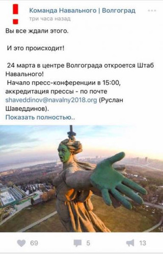 Участники поисковых отрядов и простые жители Волгограда возмутились вандализмом в отношении легендарного памятника "Родина-мать", который устроила так называемая "команда Алексея Навального" перед открытием своего штаба в городе-герое. Напомним, что сторонники Навального опубликовали в Контакте фотографию скульптуры, на котором лицо "Родины-матери" и ее рука были закрашены зеленым цветом. "В нашем тексте обращения, уже направленного в прокуратуру Волгограда, говорится - 20 марта люди, называющие себя командой Алексея Навального в Волгограде поглумились над одним из ярчайших символов Великой Победы советского народа над фашизмом - над монументом "Родина-мать зовёт!",- заявил глава волгоградского регионального отделения общественного движения по увековечению памяти погибших при защите Отечества Андрей Орешкин. "В своей официальной группе в одной из социальных сетей они представили священный для всех волгоградцев и россиян образ Родины, зовущей своих сыновей на битву с врагами, с раскрашенным зеленым цветом лицом и рукой. Сделали они это, желая угодить своему лидеру Навальному", - цитирует иего слова местное издание V1.ru. "Мы, ветераны и жители города Волгограда и Волгоградской области, считаем мерзкий поступок команды Навального насмехательством над символом Победы и плевком в каждого ветерана и солдата, погибшего во имя освобождения от фашизма", - цитирует СМИ заявление поисковиков, ветеранов и горожан. "Мерзость. Просто рафинированная, абсолютная мерзость и скотство. Пока эти сумасшедшие сектанты мазали себя краской - это было их право. Но теперь речь идет об осквернении святого для миллионов жителей нашей страны символа. У этих отморозков нет ничего святого - ни Родины, ни матери",- пишет в своем Facebook юрист Илья Ремесло. "Алексей Анатольевич, вы довольны результатами своих опытов с зеленкой? Ну вы же и сам такой, правда? Шуточки над "скрепами", фоточки, высмеивание истории...Это ваших рук дело, это вы воспитали шариковых, которые гадят на историю нашей страны, нашу Победу",- обвиняет он. "Тот момент, когда хочется призвать к чему-то нехорошему и нарушить ряд статей УК РФ. Если органы не вмешаются, это будет чревато самосудом",- добавил он в своем твиттере. "Алексей Навальный явно идет на конфликт с региональными властями с целью привлечь внимание к себе - и, безусловно, надеется на международный резонанс. Его, видимо, вдохновила история с "зеленкой", которая вышла на международный уровень, и он почувствовал, что власть надо "дожимать", - ранее заявлял политолог Алексей Мухин в интервью Pravda.ru. "А знаете, что будет? Сейчас сторонники Навального начнут обливать зеленкой в реале, не в фотошопе всевозможные "скрепные" памятники - Ленину, Дзержинскому, всякие надписи "Войковская" в метро, вывески госучреждений. Кто-нибудь еще удумает менту или ЕКХ в лицо или лобовое зеленку засадить - с понятными последствиями. Вот к гадалке не ходи, они же просчитываются как измены их толстомам в молодости. Вот только в Крыму, который ушел от Украины все тоже начиналось с планов и требования ребят из радикалов и Меджлиса свалить Ленина. Так что лучше пусть они себе [лица] мажут, иначе вместо зеленого на лицах будет красное и соленое",- пишут в телеграм. Кстати, в 2015 году мировые СМИ сообщили, что "скандальная российская панк-группа „Pussy Riot" провела акцию в центре Со