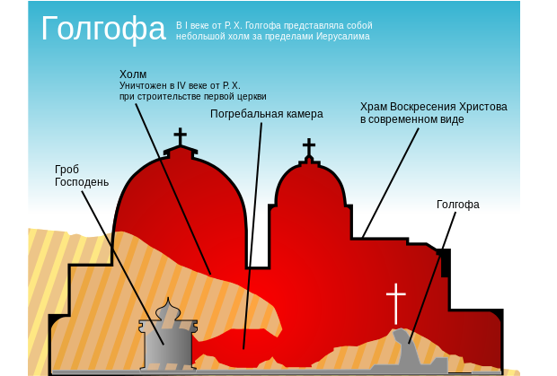Гроб Господень в Иерусалиме — самая почитаемая святыня христианского мира. Христиане верят, что на каменной плите, хранящейся здесь, три дня покоилось тело распятого Иисуса Христа. Плита (Ложе) размером 2 х 0,8 метра находилось в высеченной в скале пещере- именно так иудеи хоронили умерших в первом веке нашей эры. Почитать места, связанные с распятием и погребением Христа начали первые христиане. В 326 году императрица (августа) Елена, почитаемая сейчас многими христианскими церквями как святая, предприняла паломничество на Голгофу. В результате проведенных под ее руководством раскопок были обнаружены пещера с погребением. В числе других находок крест, на котором, как считала августа (и вслед за ней христиане всего мира до наших дней) был распят Иисус Христос, четыре гвоздя и табличка (титло) с надписью IESUS NAZARENUS REX IUDAEORUM, то есть «Иисус Назарянин, Царь Иудейский». Согласно Новому Завету, титло к кресту собственноручно приколотил Понтий Пилат. Елена заложила вокруг ложа храм (Кувуклию), куда начали стекаться христианские паломники со всего мира. Храм выглядел как купольная мраморная часовня.