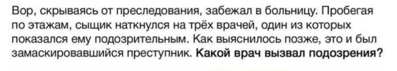 В связи с вопросом о внимательности, мне вспомнился старый анекдот про врачей: Профессор медицины проводит лекцию для студентов в анатомичке у исследуемого трупа. Профессор говорит, - "Врач не должен бояться покойников, должен быть не брезгливым и очень, очень внимательным". Он засовывает свой палец в труп, а потом кладёт палец в рот. Потом говорит студентам, - "Кто из вас проделает то же самое - тот настоящий врач". Один студент подходит к трупу, проделывает то же самое и кладёт палец в рот. После этого профессор говорит, - "Я же сказал, что врач должен быть очень очень, очень внимательным. Я в труп засунул один палец, а в рот положил другой".
