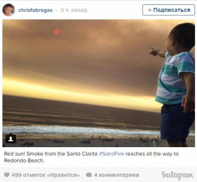 Жители Лос-Анджелеса массово выкладывают в социальных сетях фотографии кровавого солнца, нависшего над городом в выходные. На обилие снимков в американском сегменте соцсетей обратило внимание издание Mashable. Некоторым из очевидцев показалось, что светило может предвещать апокалипсис. «Если на Марсе есть пляжи и люди», — написал один из пользователей под фотографией побережья, освещаемого солнцем. Необычно красный цвет солнца и обрамляющая его кайма связаны с тем, что небо над Калифорнией застилает дым от пожаров, которые бушуют в пригороде Лос-Анджелеса. Над районом бедствия поднимаются клубы густого дыма. По последним данным, в результате пожара погиб, по меньшей мере, один человек, разрушены около 20 домов. Огнем охвачено более 22 тысяч гектаров земли. Попавшие в район возможного распространения огня местные жители эвакуированы в спецпункт, организованный Красным Крестом. В июне 2016 года лесные пожары добрались до пригорода Лос-Анджелеса, где проживают поп-исполнитель Джастин Бибер, семейство Кардашьян из одноименного реалити-шоу, певицы Тони Брэкстон, Мэрайя Кэри, Джессика Симпсон и другие знаменитости. Всего из трех тысяч домов были эвакуированы около пяти тысяч жителей.