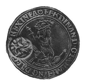 (Иоахимстальный талер Фердинанда I (1527-1580), надчеканенный круглым клеймом с двуглавым орлом. Считается, что он был чеканен в горной чешкой деревушке Иоахимсталь и стал эталоном для всей Европы. Но это очевидный подлог – на эталонных «чешских» талерах стоит русский герб. Так приходовались вассальные талеры в русскую казну до введения Иваном Грозным нового весового стандарта по серебру «16SS»).